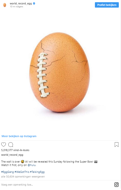 Begin januari kreeg de eerste foto het grootste aantal vind-ik-leuks op Instagram ooit. Nadat het record was gebroken, publiceerde het Instagram-account drie nieuwe foto's met steeds grotere scheuren. Een vierde foto toonde een plastic veter voor een bal, een verwijzing naar American football. In de bijgaande tekst werd verwezen naar de Super Bowl en Hulu.