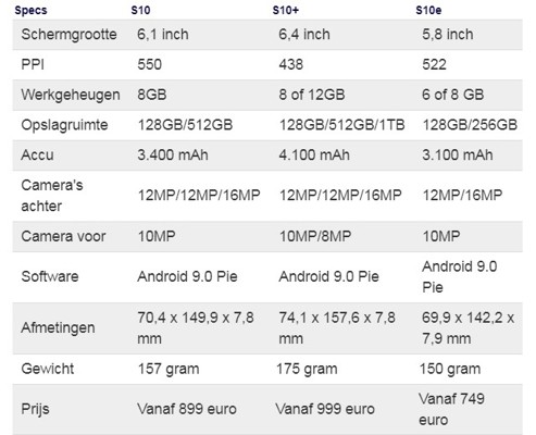 Specificaties Galaxy S10
